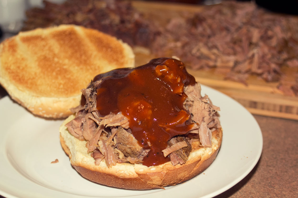 - Heap a whole bunch of meat onto your bun and drench in BBQ Sauce