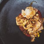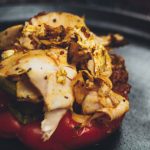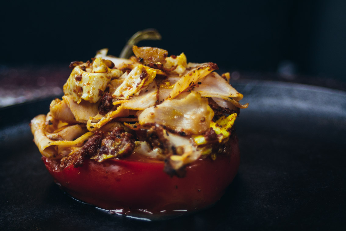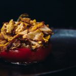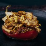 - Gather the chorizo, egg, and meat together and stuff it into the pepper (which should still be on the pan).