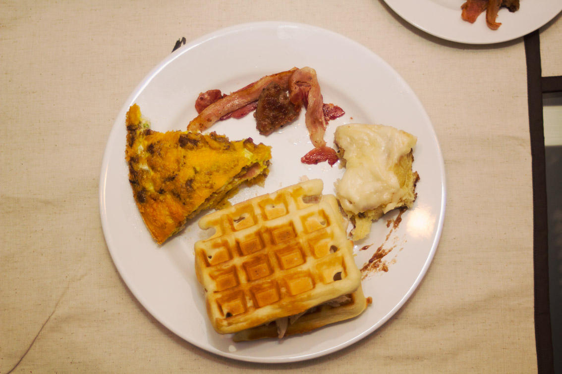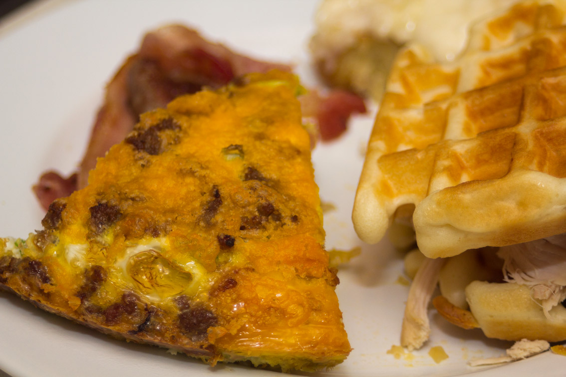 - I served this Breakfast Quiche with Waffles, Bacon, Sausage, and Cinnamon Rolls.