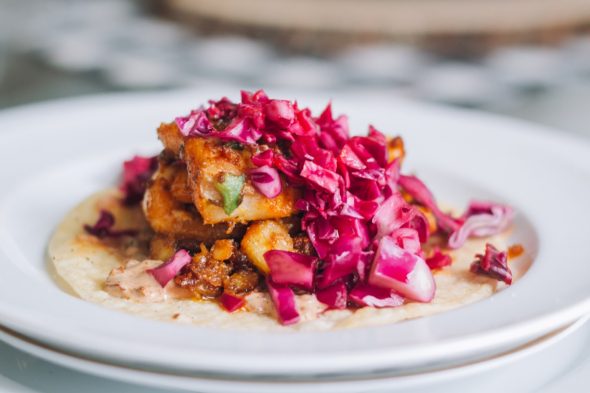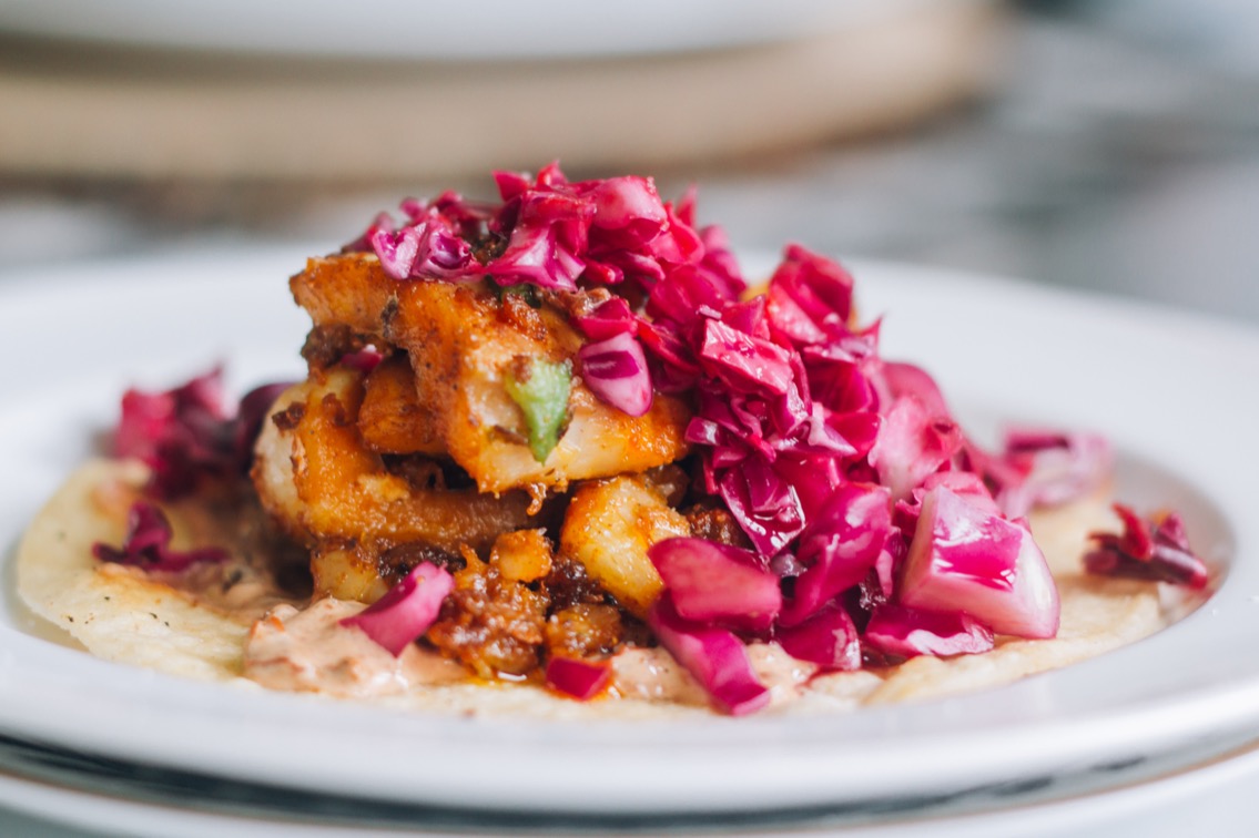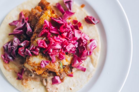 - Assemble: Spread the spicy mayo on the tortilla, add some fish pieces, top with cabbage and enjoy!