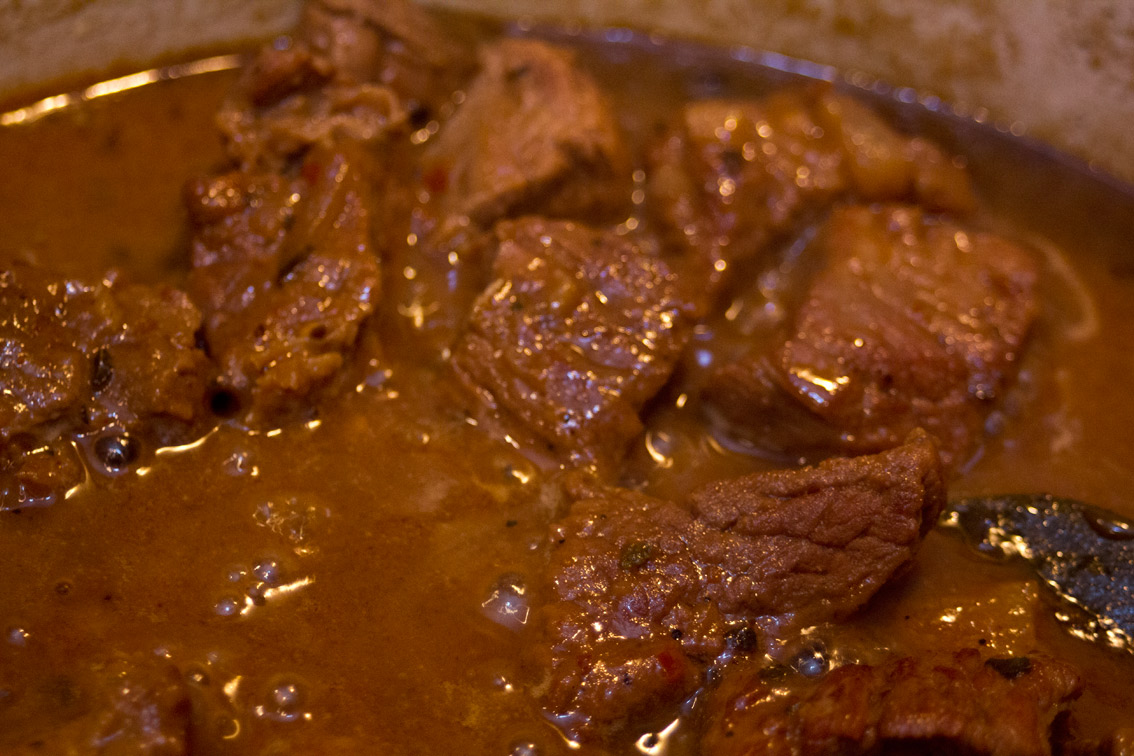 - Trim the fat off the meat and then cut it into large bite sized pieces.