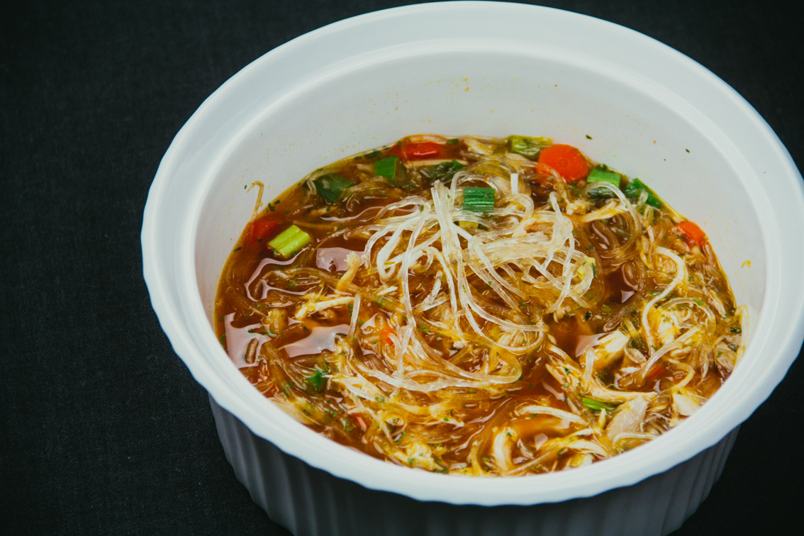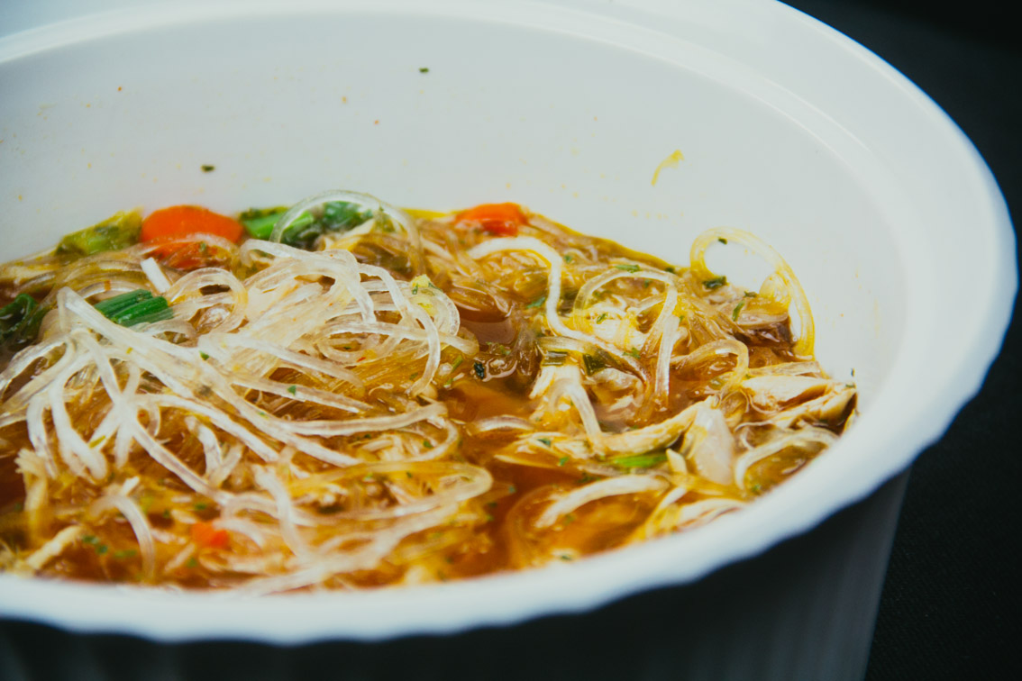 - In your bowl put as many noodles as you want, then ladle in the soup. Garnish with Lime Juice, Cilantro, & Siracha.