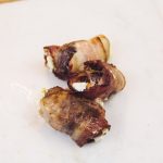 - Wrap all of your stuffed Dates with Bacon and place on a baking sheet