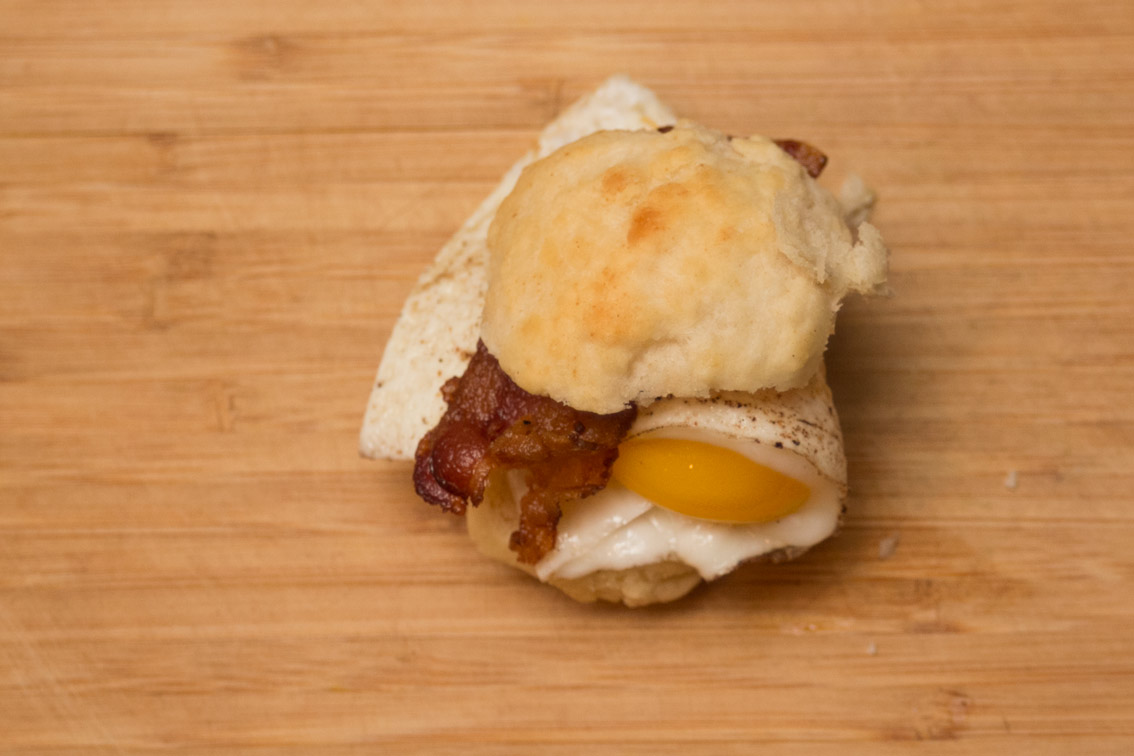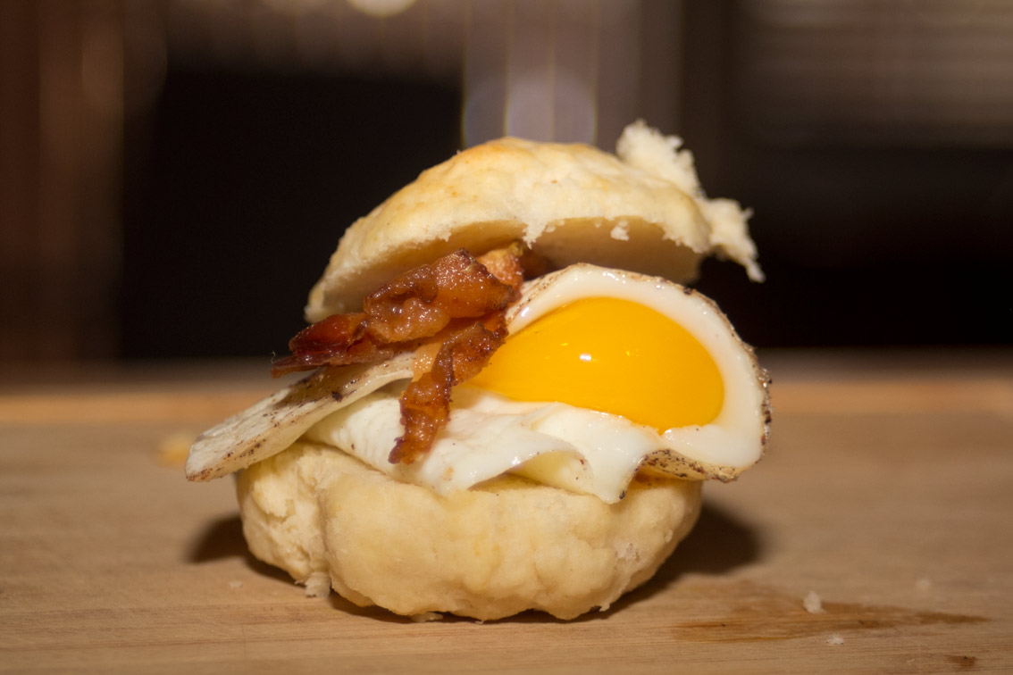 - Cut your biscuits in half when they come out of the oven and fill with bacon and eggs (and optionally cheese).