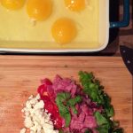- Mix all the ingredients together in a bowl (scramble the eggs) and pour into (small) baking dish.