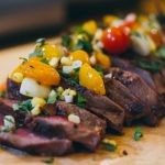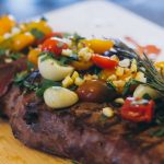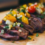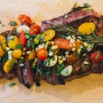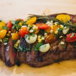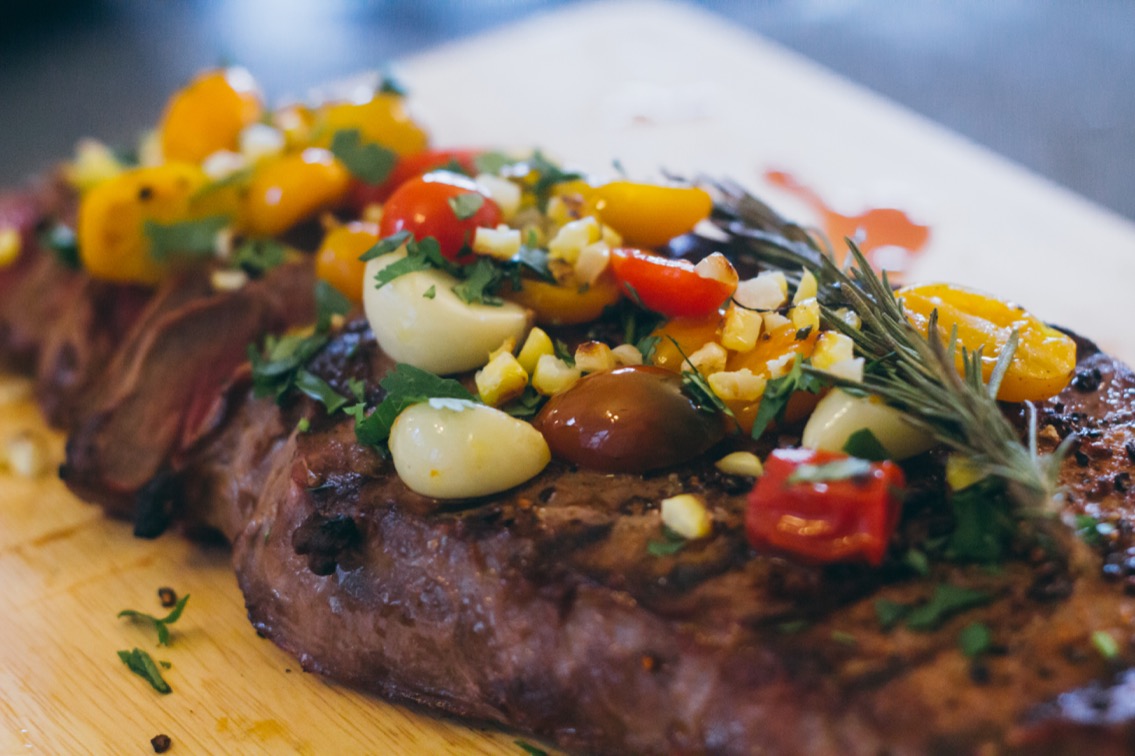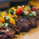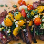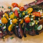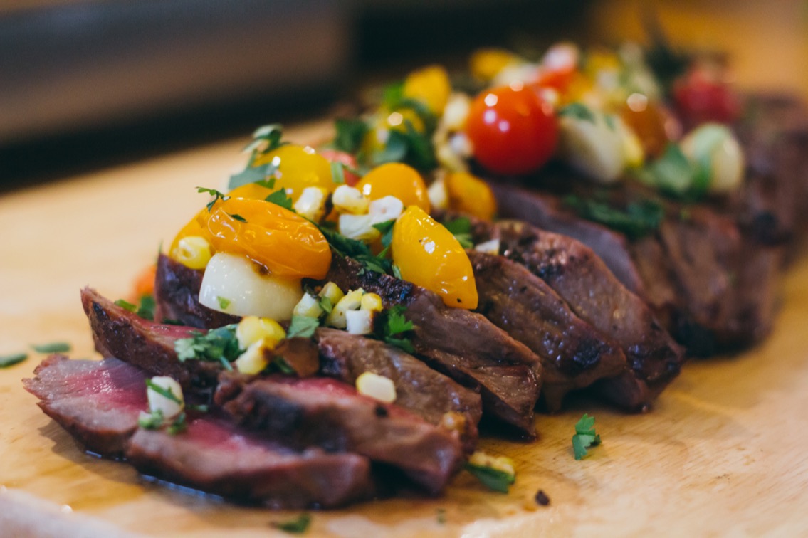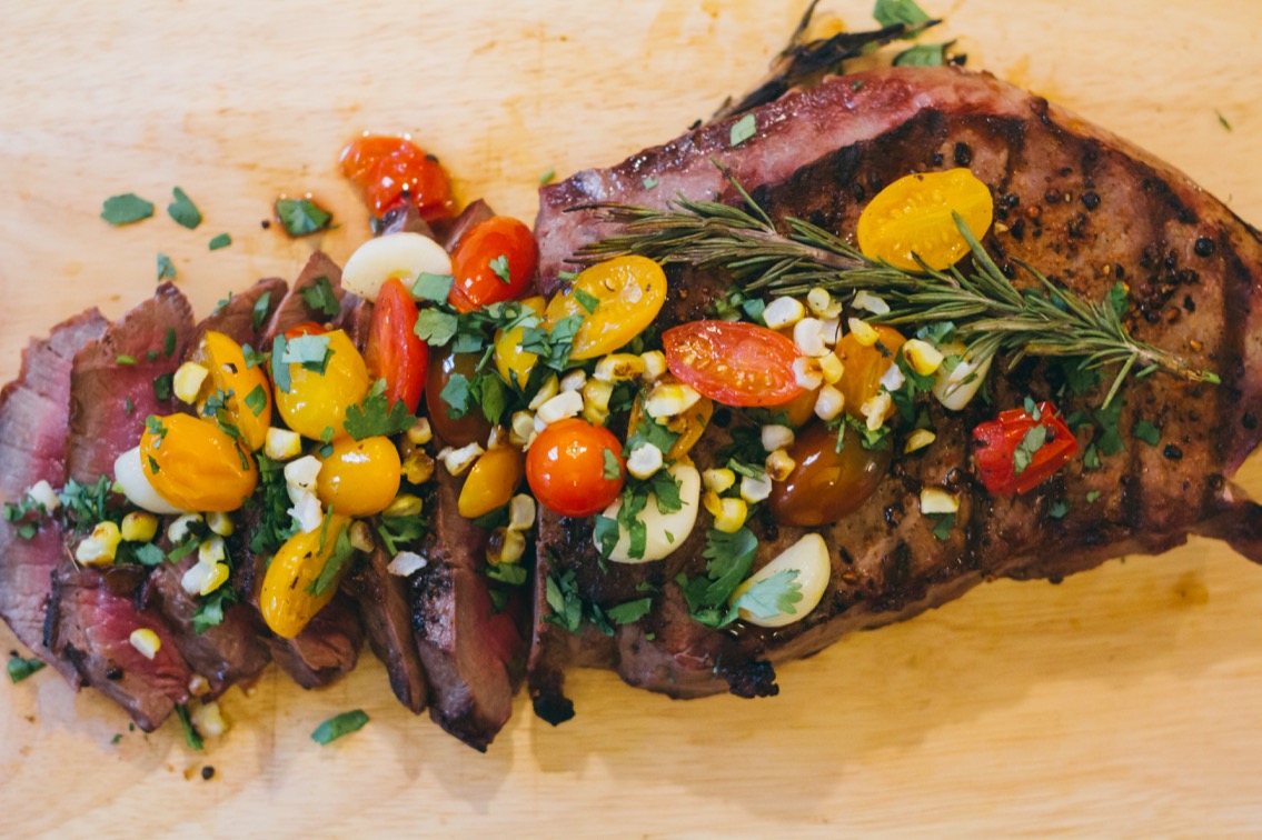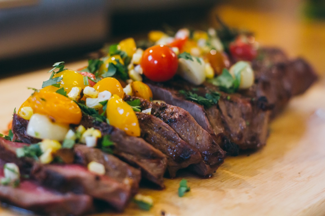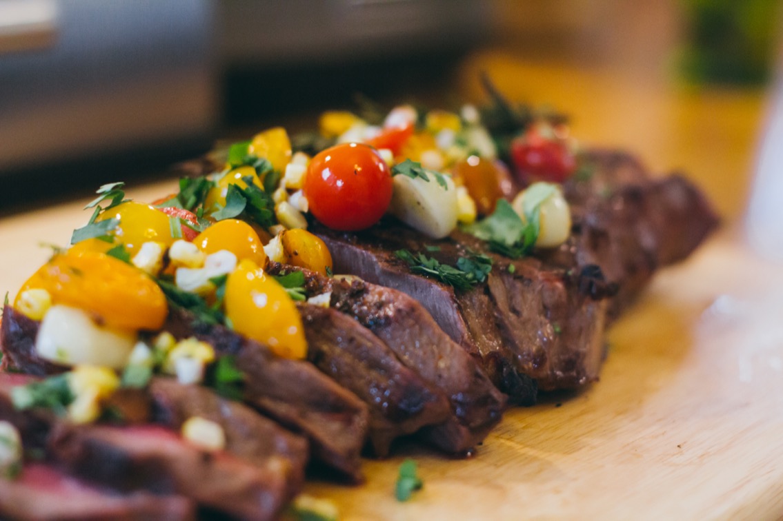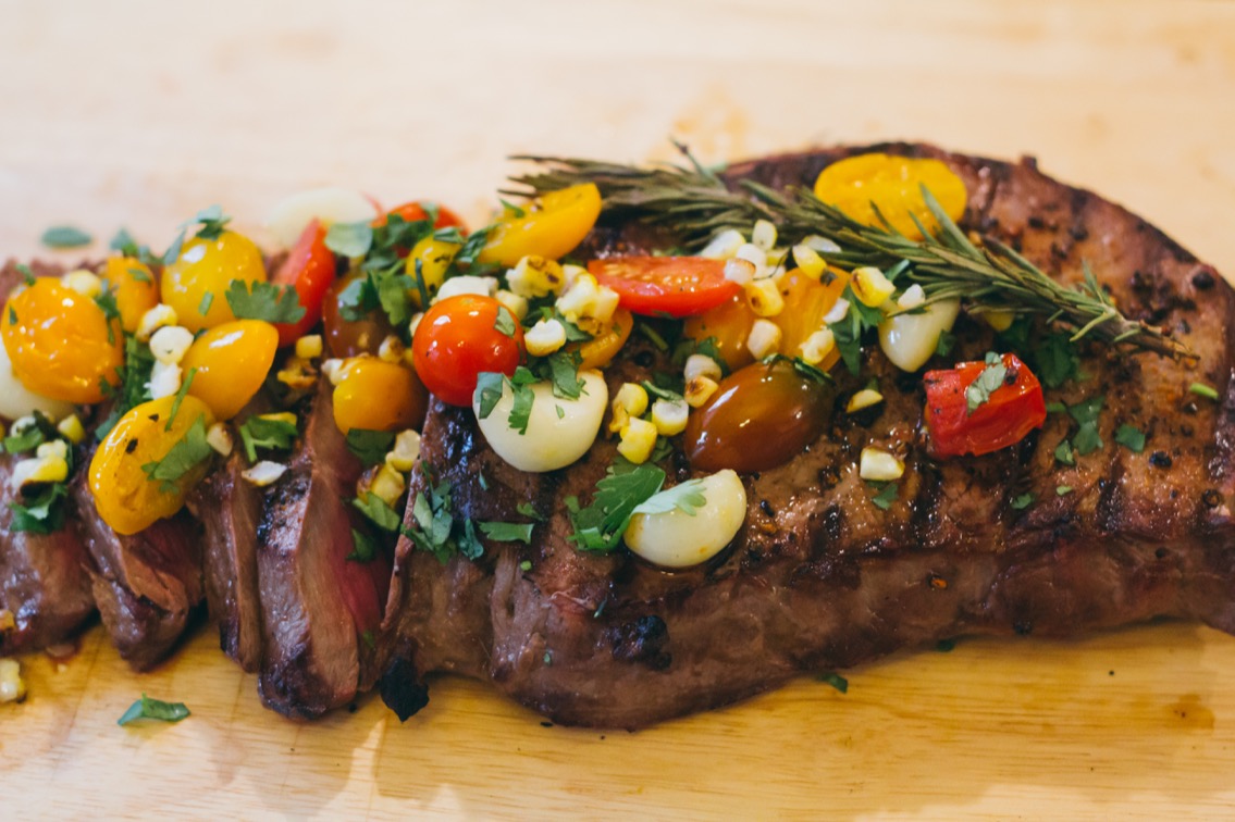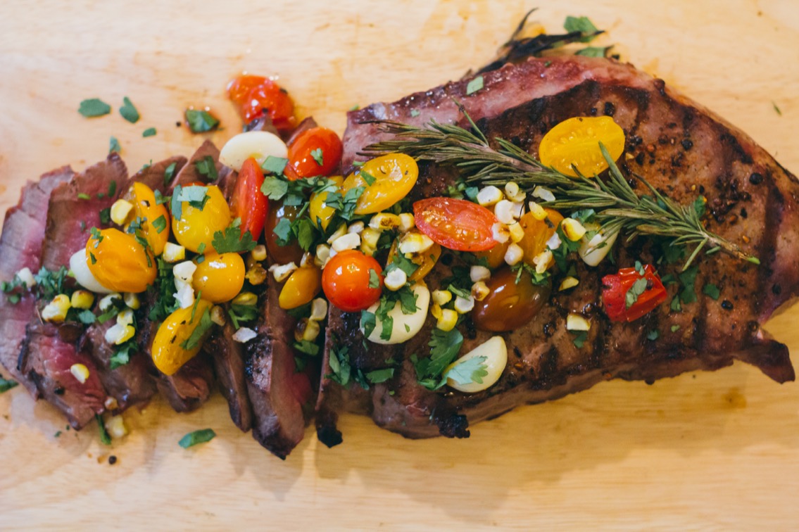 - Cut the roasted corn off of the cob/ear, chop up a little cilantro. And when your meat is done resting, slice it against the grain and top with the garnish (corn, cilantro, and contents of foil packet).