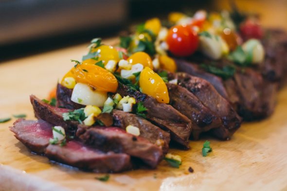 - Cut the roasted corn off of the cob/ear, chop up a little cilantro. And when your meat is done resting, slice it against the grain and top with the garnish (corn, cilantro, and contents of foil packet).