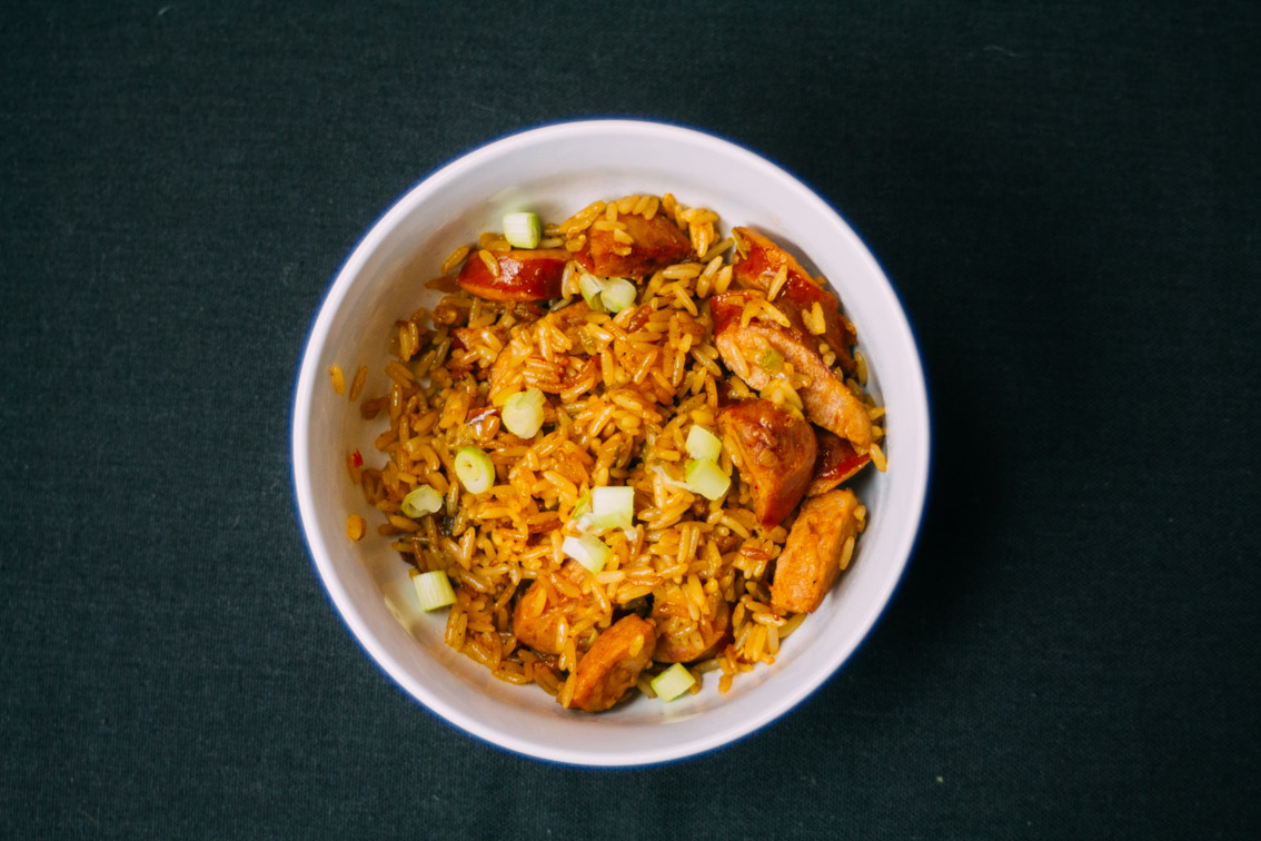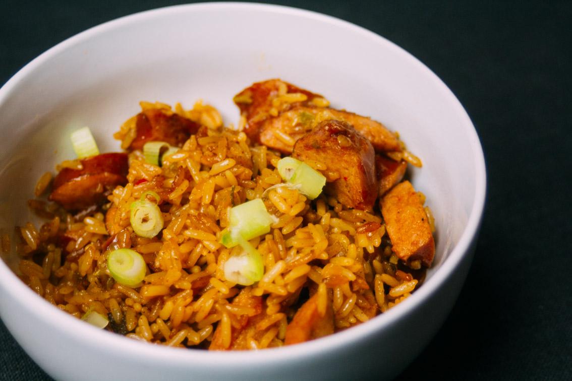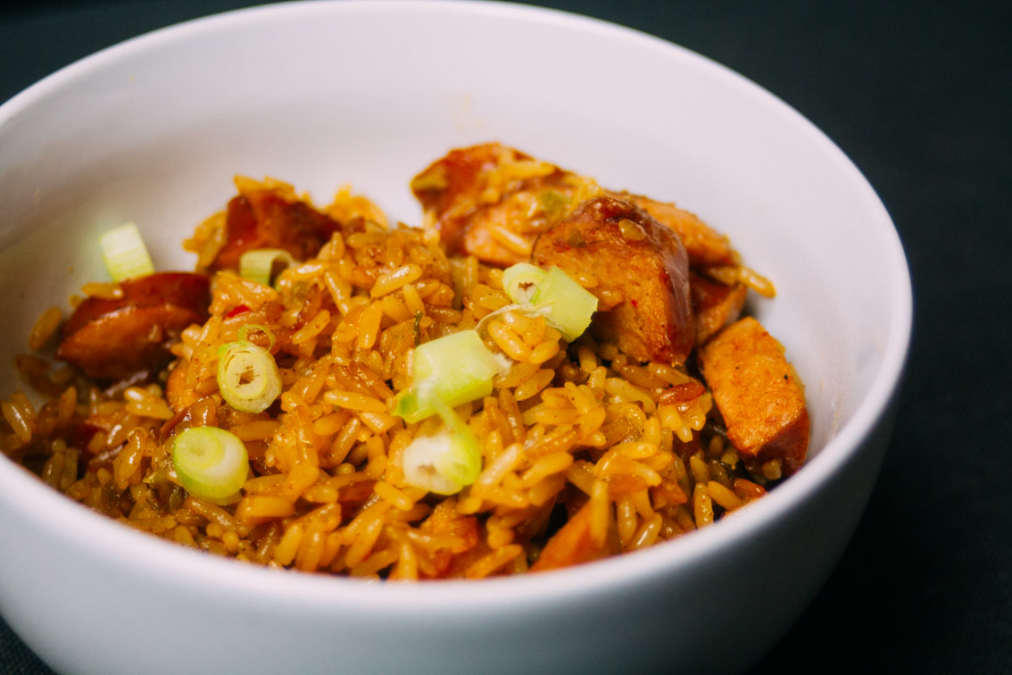 - Pour water, Rice, Smoked Sausage, and Vegetable Oil into a Cast Iron Skillet