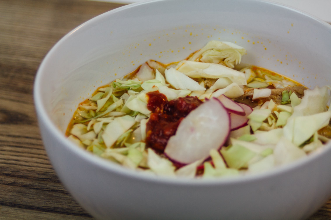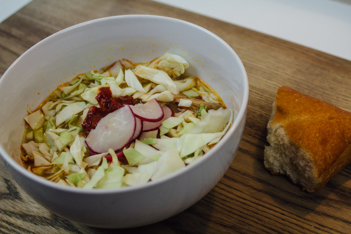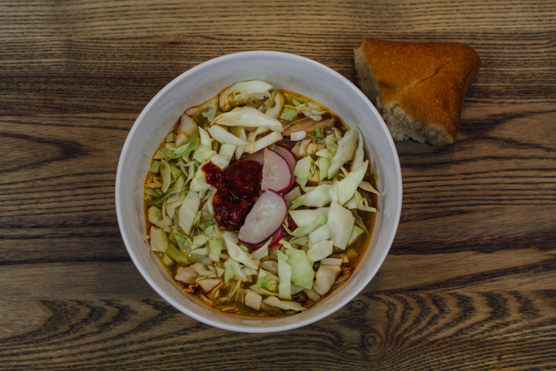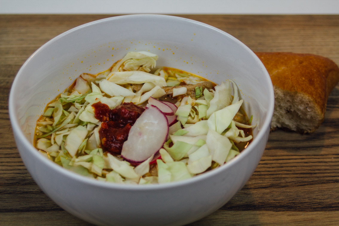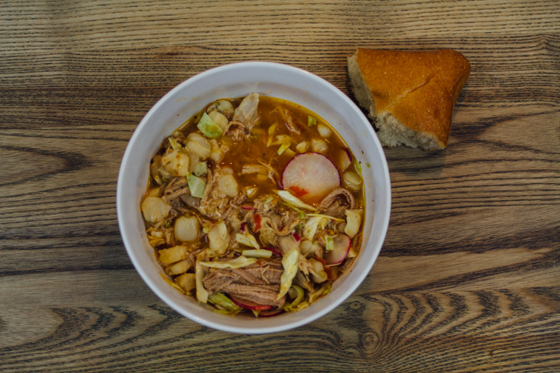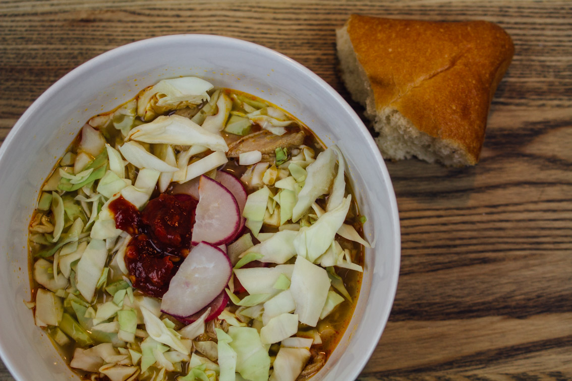 - Serve with Oregano, Green Cabbage, Radish, Red Chile, Lime, and Bolillo Rolls.